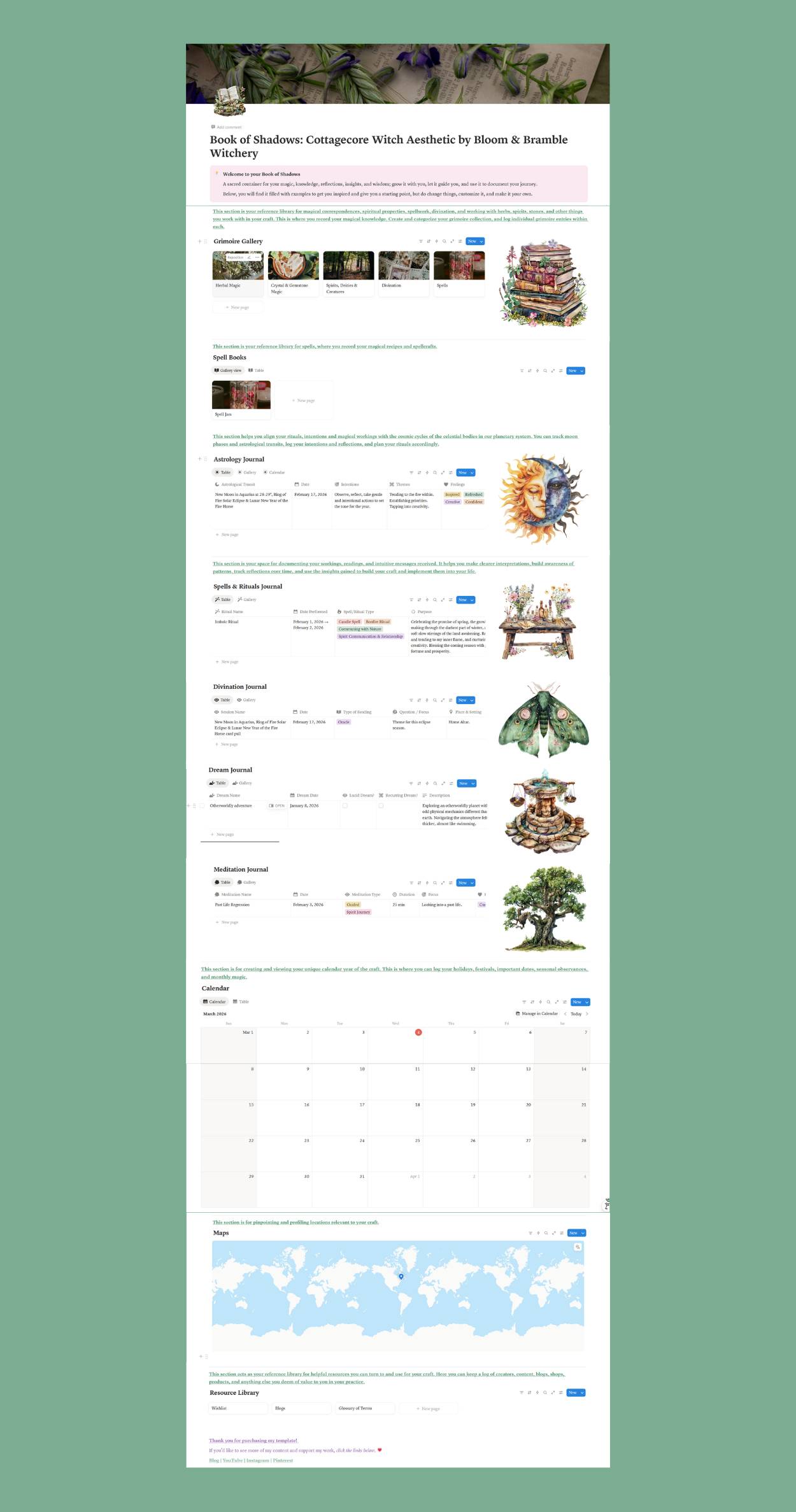 Keep your book of shadows as a living digital document with this Notion template, made for the cottagecore witch in you. This template provides a beautiful foundation to get started in documenting your journey and recording knowledge. It includes:
